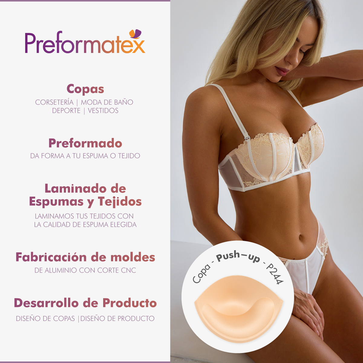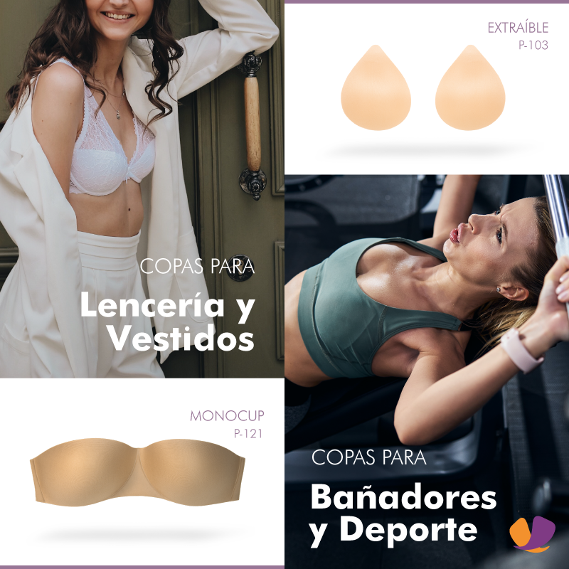 Somos Especialistas en Preformado y Laminación Textil. Copas de Relleno, Bra Cups, Cazoletas, Foam para Confección, Laminado de Tejidos, Preformado de Tejidos. Más de 300 modelos diferentes: Copas Extraíbles, Push-Ups, Triangulares, Bandeaus, Balconettes, Monocups, Deporte, Clásicas, Culotte, y Formas Ortopédicas.